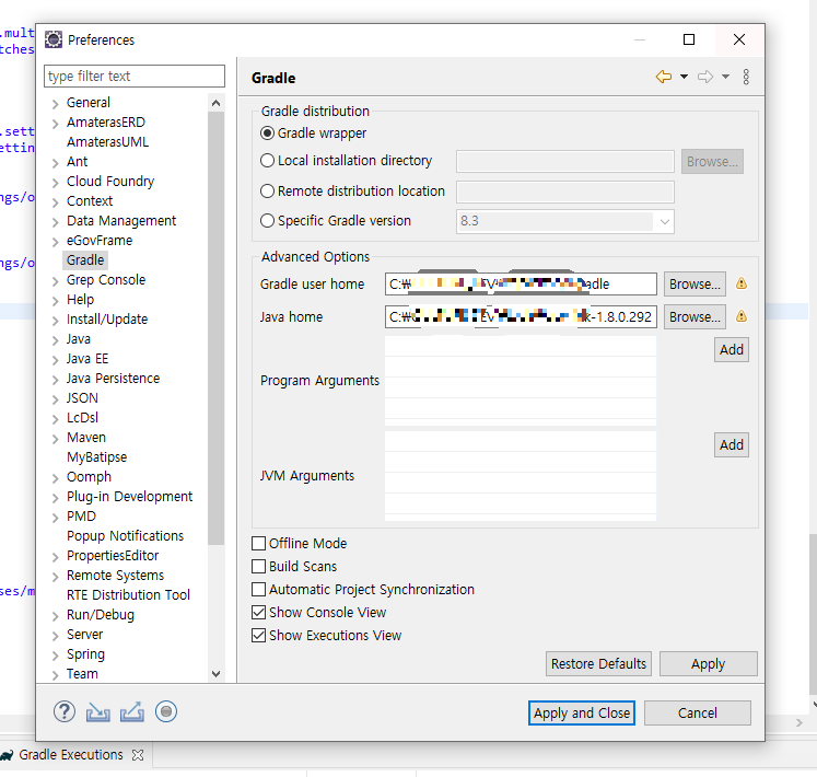 Window - Preferences - Gradle 에서 Java home 항목에 jdk 경로를 설정해주면 된다.