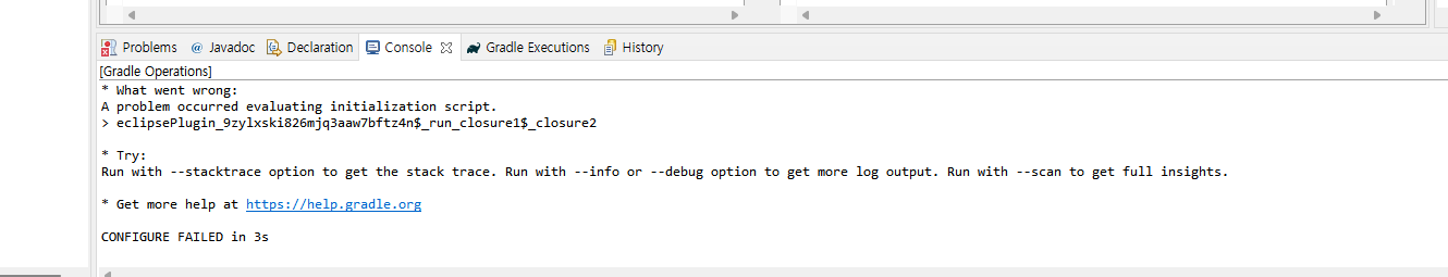 또한 이클립스에서 Gradle Tasks 항목을 열면 그래들의 task들을 아예 읽지도 못 하는 현상이 발생했다.