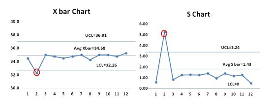 Xbar-R 차트와 마찬가지로 Xbar-S 차트는 부분군 데이터에 사용된다. 그러나 범위 대신 S 차트는 각 하위 그룹 내의 표준 편차를 모니터링하여 공정 변동의 다른 척도를 제공한다.