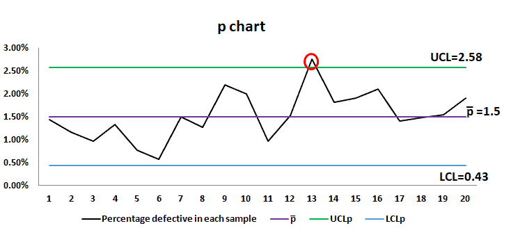 불량 특성의 부분군이 이항 분포를 따를 때 결함이 있는 항목의 비율 또는 비율을 모니터링하는데 사용된다. 특히 프로세스의 결함이나 부적합 사항을 처리할 때 유용하다.