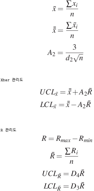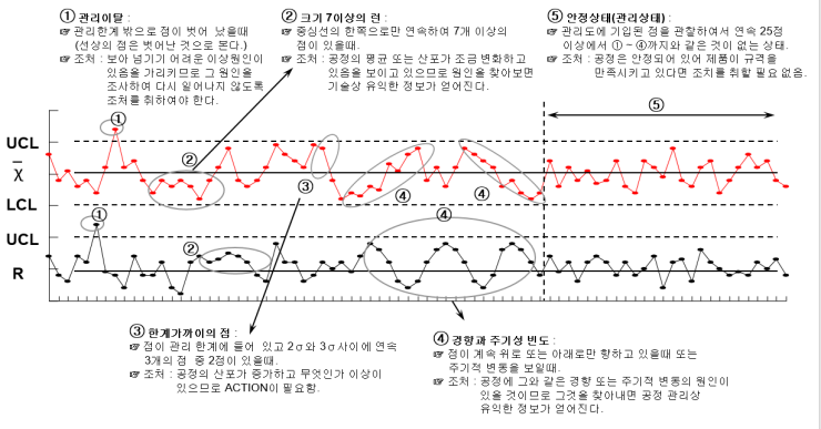 각 부분군의 평균치(Xbar), 범위(R)를 각각 Xbar 관리도 R관리도에 타점하고 Xbar 관리도에서는 평균의 변화율을 R 관리도에서는 부분군 내 산포 변화를 관리한다.