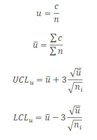 부분군 크기가 일정하지 않을 때 적합하며 결점 수를 일정 단위당으로 묶어(일정 면적당 결점수 등) 공정 관리가 가능하다.