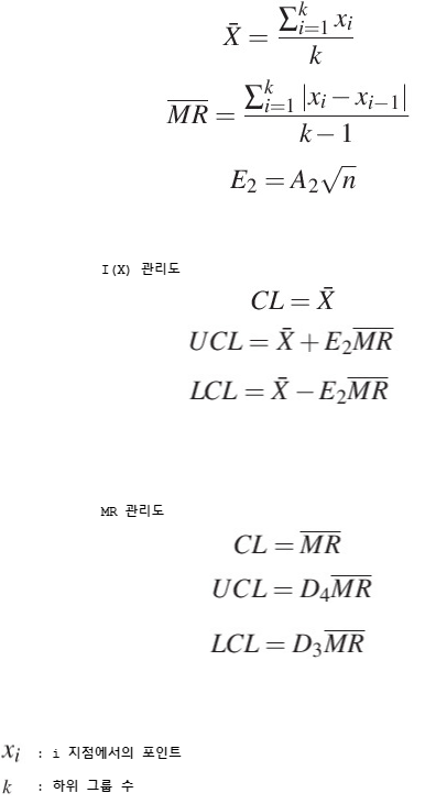 | I-MR Chart | 중앙치와 범위의 관리도 | 부분군의 개수가 1이거나, 생산량이 적거나, 제품 제조 주기가 길거나, 이동과 표류가 문제일 때 | |