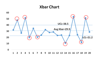 Xbar 차트는 일정한 크기의 연속적인 표본의 평균을 모니터링하는 데 사용된다. 즉, 평균치 변화 관리하는데 사용된다.