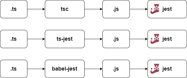 세 방법의 공통점은 타입스크립트 코드를 자바스크립트 코드로 변환한 후, Jest를 이용하여 자바스크립트 코드를 테스트한다는 점이고, 변환하는 도구에 차이가 있을 뿐이다.
