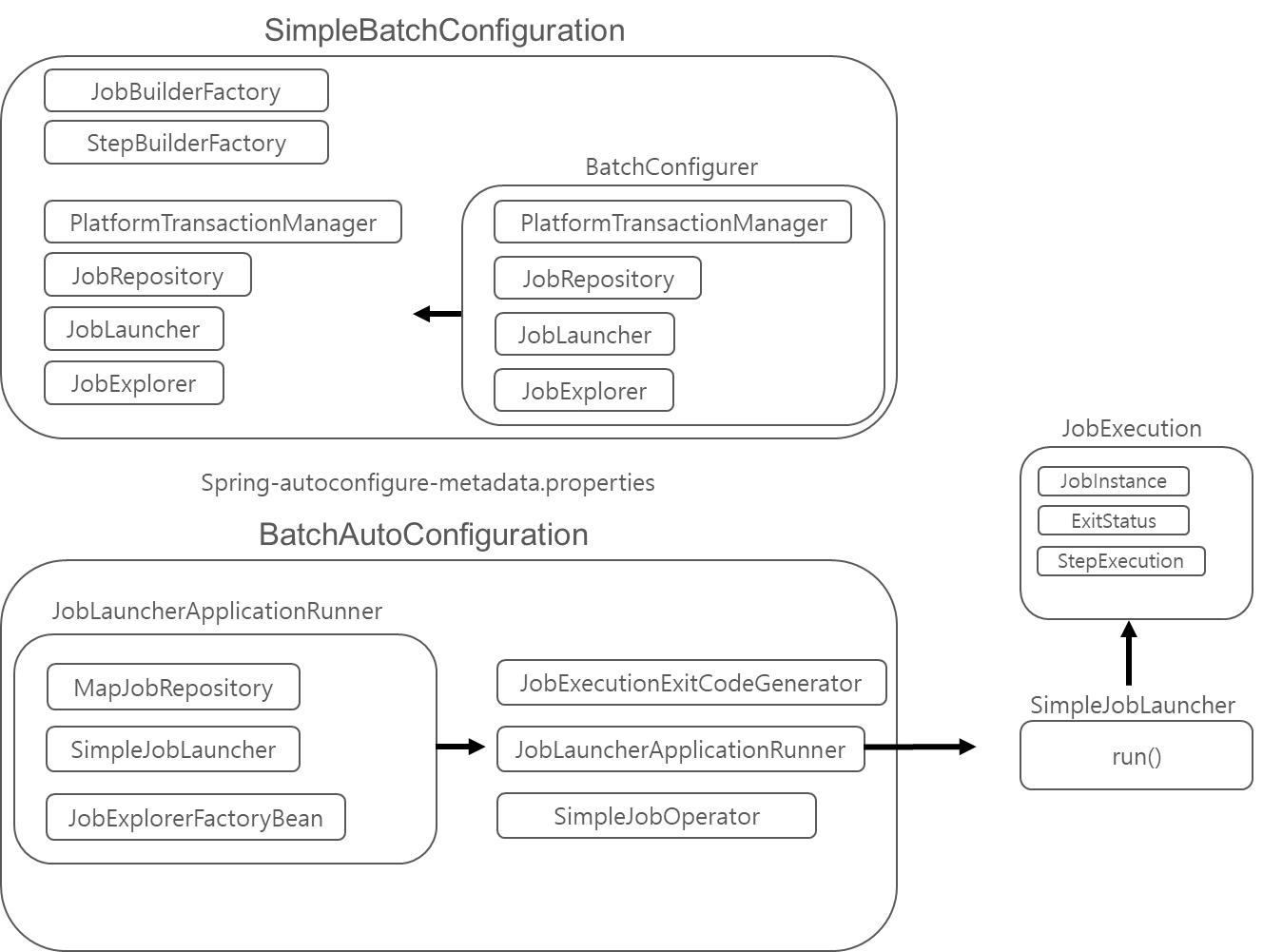 BatchAutoConfiguration이 자동 생성되며 Configuration 정보를 바탕으로 JobLauncherApplicationRunner가 생성된다.