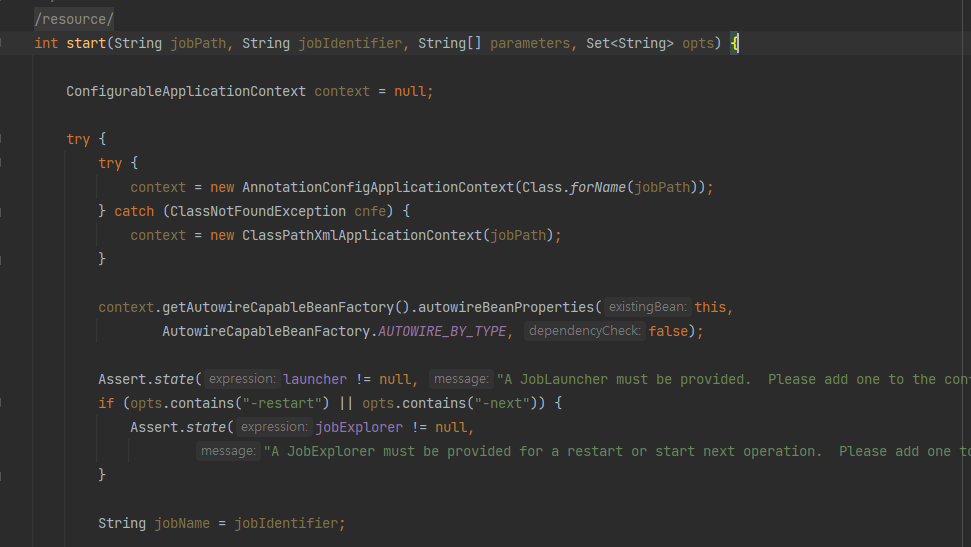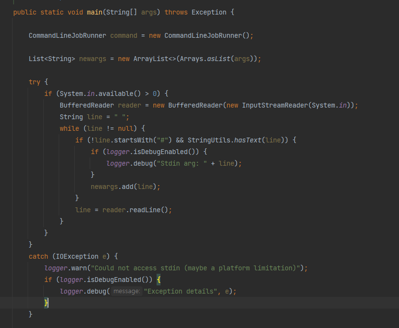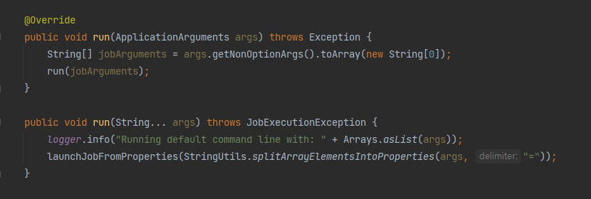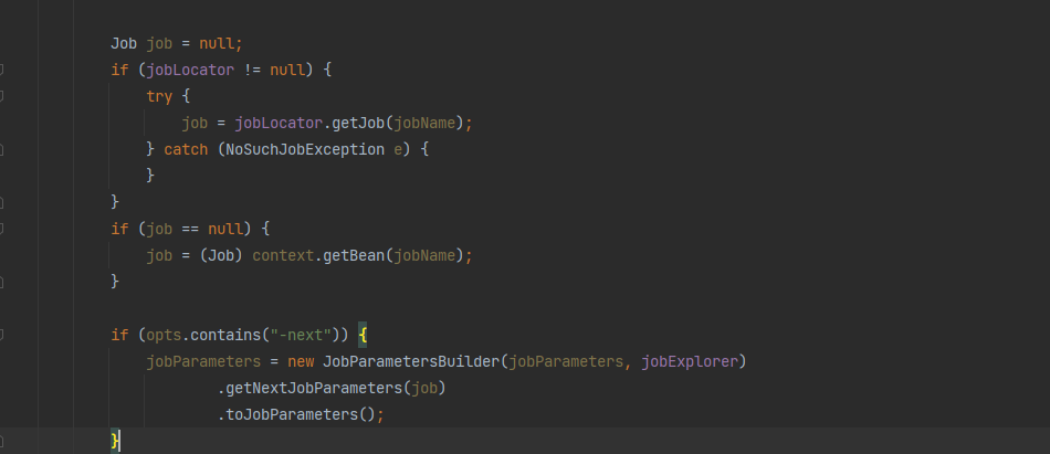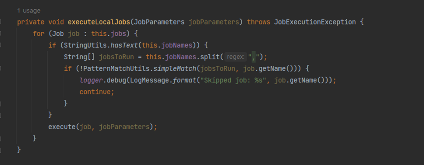 또한 Argument를 통해 내가 실행하고자 하는 특정 Job만 실행이 가능하다. 아래 소스코드처럼 Argument로 전달받은 jobName과 일치하는 Job일 때 실행하는 내용이 구현되어 있는 것을 볼 수 있다.