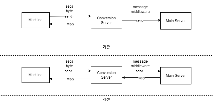 이와 같은 문제를 개선하기 위해선 메인서버의 작업이 종료된 후 작업 결과에 따른 reply가 가장 이상적이나 네트워크의 지연이나 처리 속도 등에 따른 영향으로 timeout이 발생할 것 같아 메인서버에서 메세지를 수신하면 Reply를 응답하는 방식으로 개선할 예정입니다.