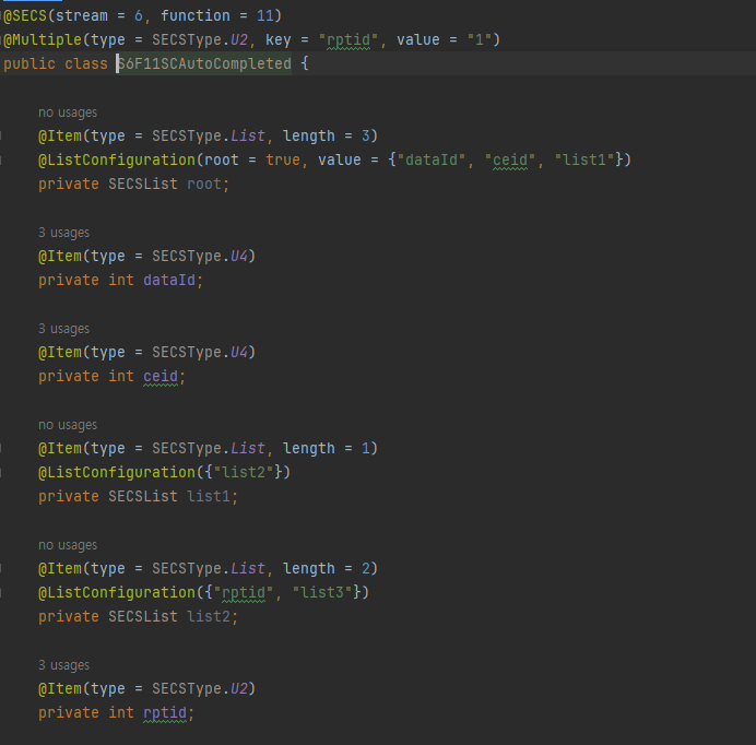 예를 들어 다음과 같은 인터페이스일 경우 반도체 장비와의 데이터 통신은 소켓 통신을 이용한 byte 전송을 하며 byte는 설계된 인터페이스를 SECS 프로토콜을 이용해 byte array로 변환하여 송수신 합니다.