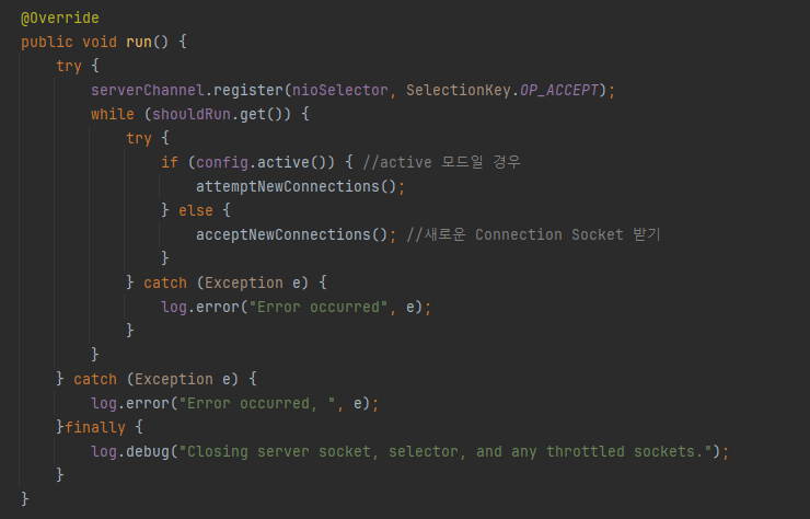 Acceptor 클래스는 클라이언트 소켓이 요청한 accept를 처리하거나 active 모드일 경우 클라이언트의 역할을 수행하기 위해 accept 요청을 서버 소켓으로 시도합니다.