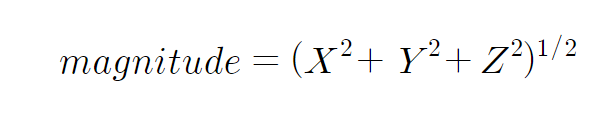 지자기센서의 출력을 사용하는 방법은 크게 2가지로 나뉘다. 각 축의 출력 패턴을 그대로 이용하여 사용하는 경우와 전체 크기를 이용하는 방법으로 이때 전체 크기는 다음과 같이 구할 수 있다.