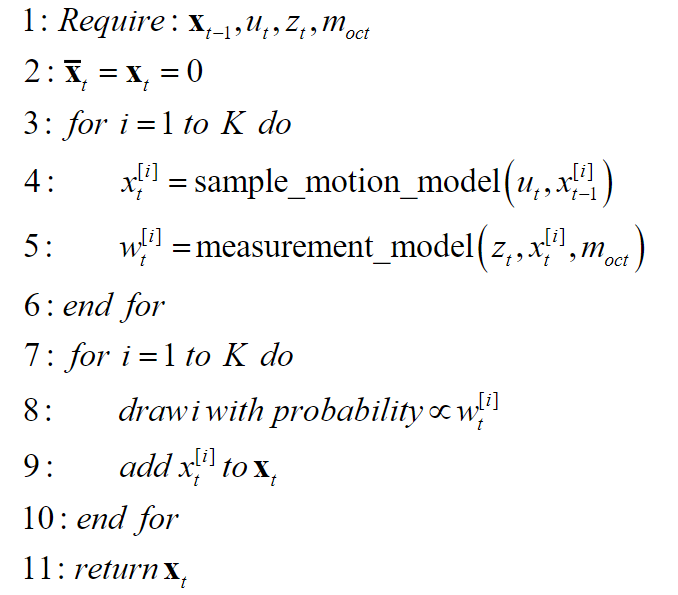 MCL 알고리즘은 Sample Motion Model, Measurement Model, Resampling 3단계로 구분한다.