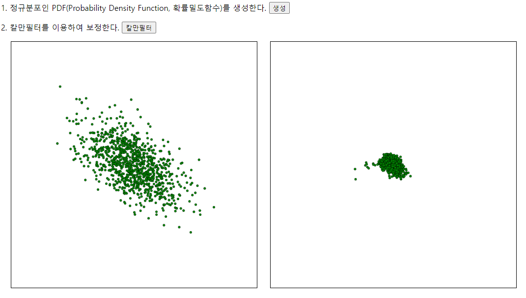 칼만 필터를 적용할 수 있는 정규분포를 따르는 x, y 좌표 배열을 생성합니다. 생성된 좌표를 web으로 보여주고